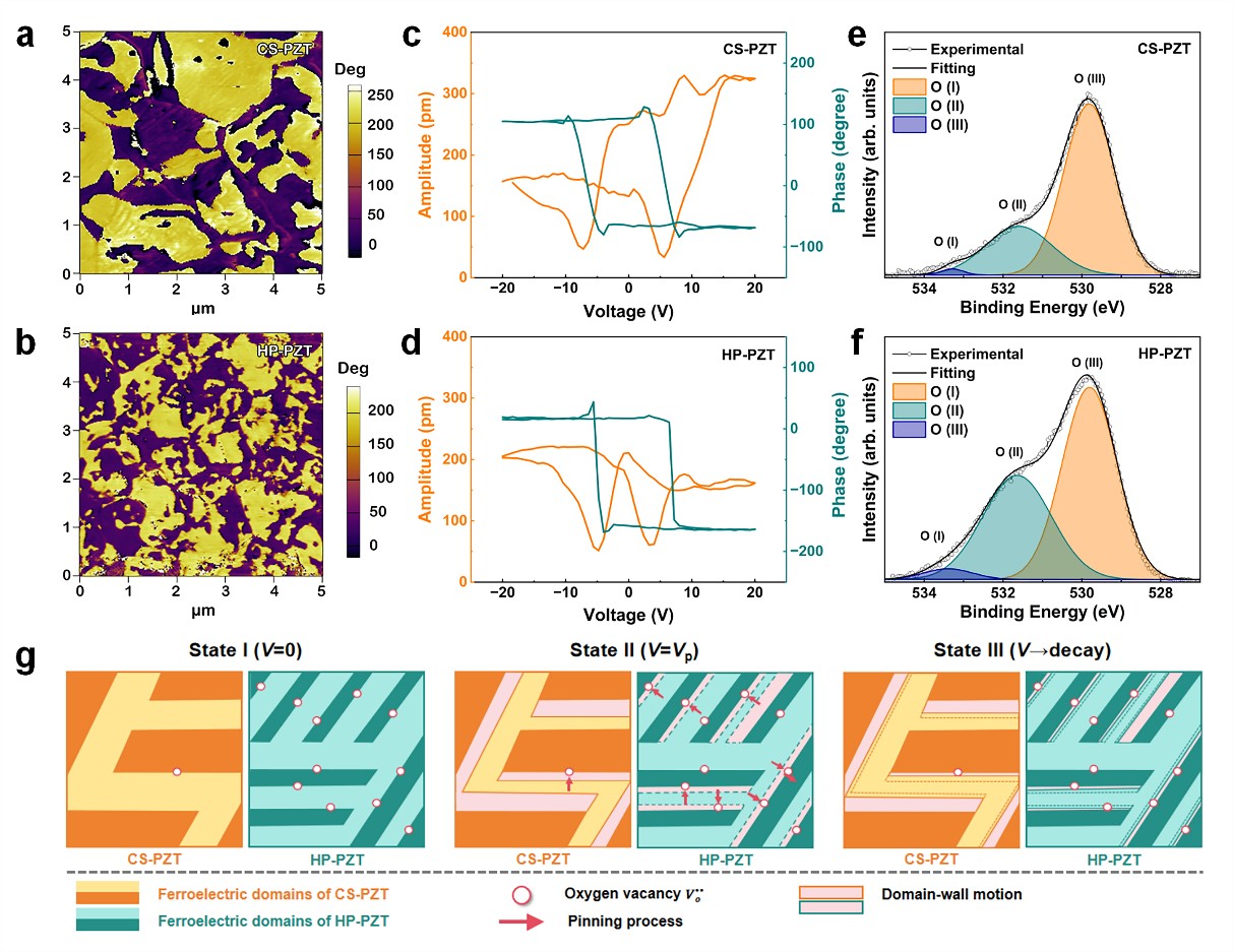 研究表明,热压工艺显著改善了材料微结构。如图1所示,热压烧结 PZT 陶瓷(HP-PZT)致密度明显提高、晶粒细化,以四方相为主,同时展现出较常规烧结 PZT(CS-PZT)更好的结构稳定性。变温拉曼与介电温谱测试显示,相较常规样品,HP-PZT 的热稳定性进一步提升,能够在高温下仍保持稳定的介电与铁电特性(图 2)。在高功率驱动下,HP-PZT 表现突出:最大振动速度达到 2.5 m/s,而 CS-PZT 仅为 1.7 m/s;当振动速度为 1.0 m/s 时,其机械品质因数的保持性显著优于常规样品(图 3)。这些结果表明,热压工艺有效提升了压电陶瓷的能量转换效率与高功率稳定性。研究团队进一步通过压电力显微镜(PFM)与X 射线光电子能谱(XPS)等手段揭示了氧空位与畴壁之间的相互作用机制(图 4):热压诱导的氧空位可在强场下有效“钉扎”畴壁,抑制不可逆畴运动;叠加热压引入的内应力场,共同构成高功率稳定性的核心来源。