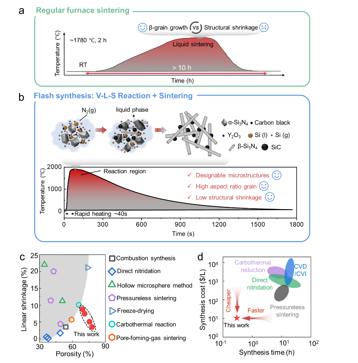 图1. 多孔氮化硅基陶瓷合成示意图与传统方法在收缩率、合成成本及时间上对比