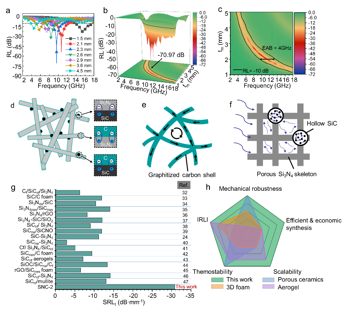 在功能性方面,得益于多尺度微结构(界面特征、纳米石墨化碳层及多级孔结构),材料展现出优异的电磁波吸收性能,在匹配厚度2.3mm下反射损耗低至-70.97dB,比吸收强度处于同类整体型吸收材料的领先水平。研究显示材料在高温氧化环境中处理后,仍能保持90%以上的电磁波吸收,证明了其在雷达隐身应用中的巨大潜力。