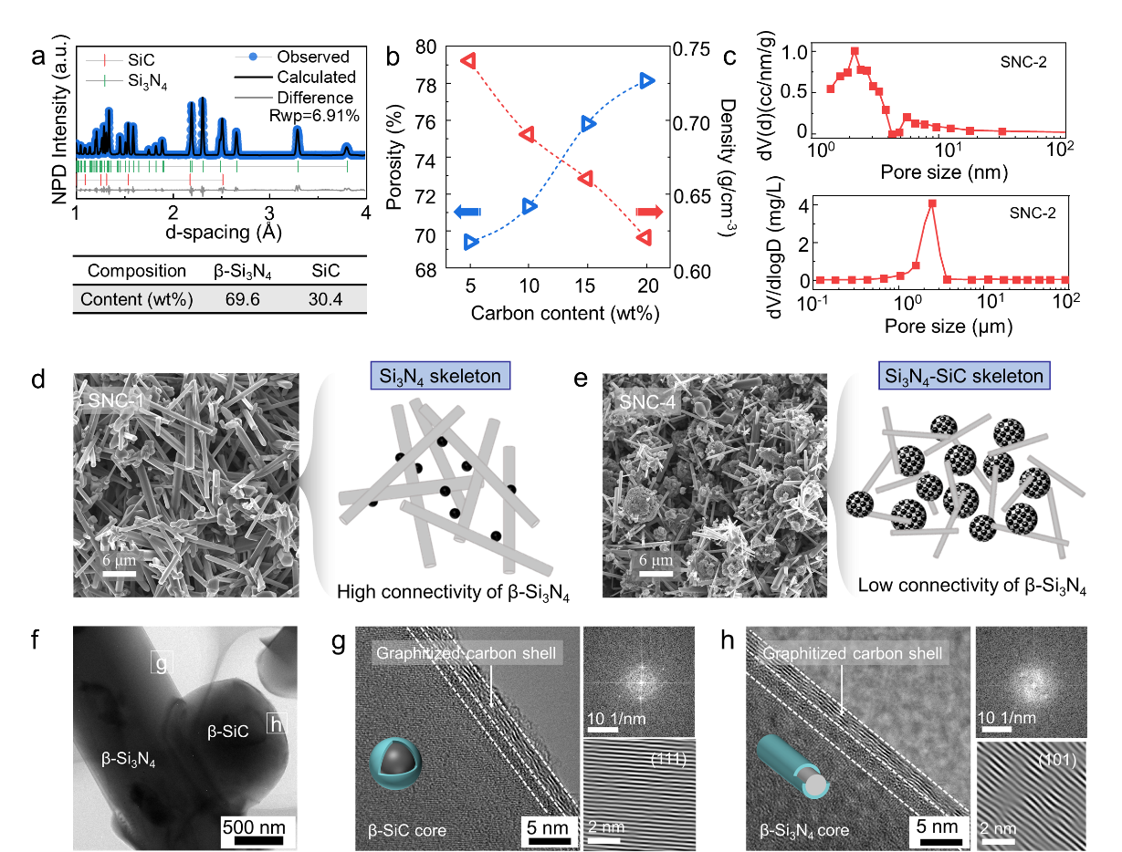 图2. 多孔Si3N4/SiC陶瓷物相与微结构特征