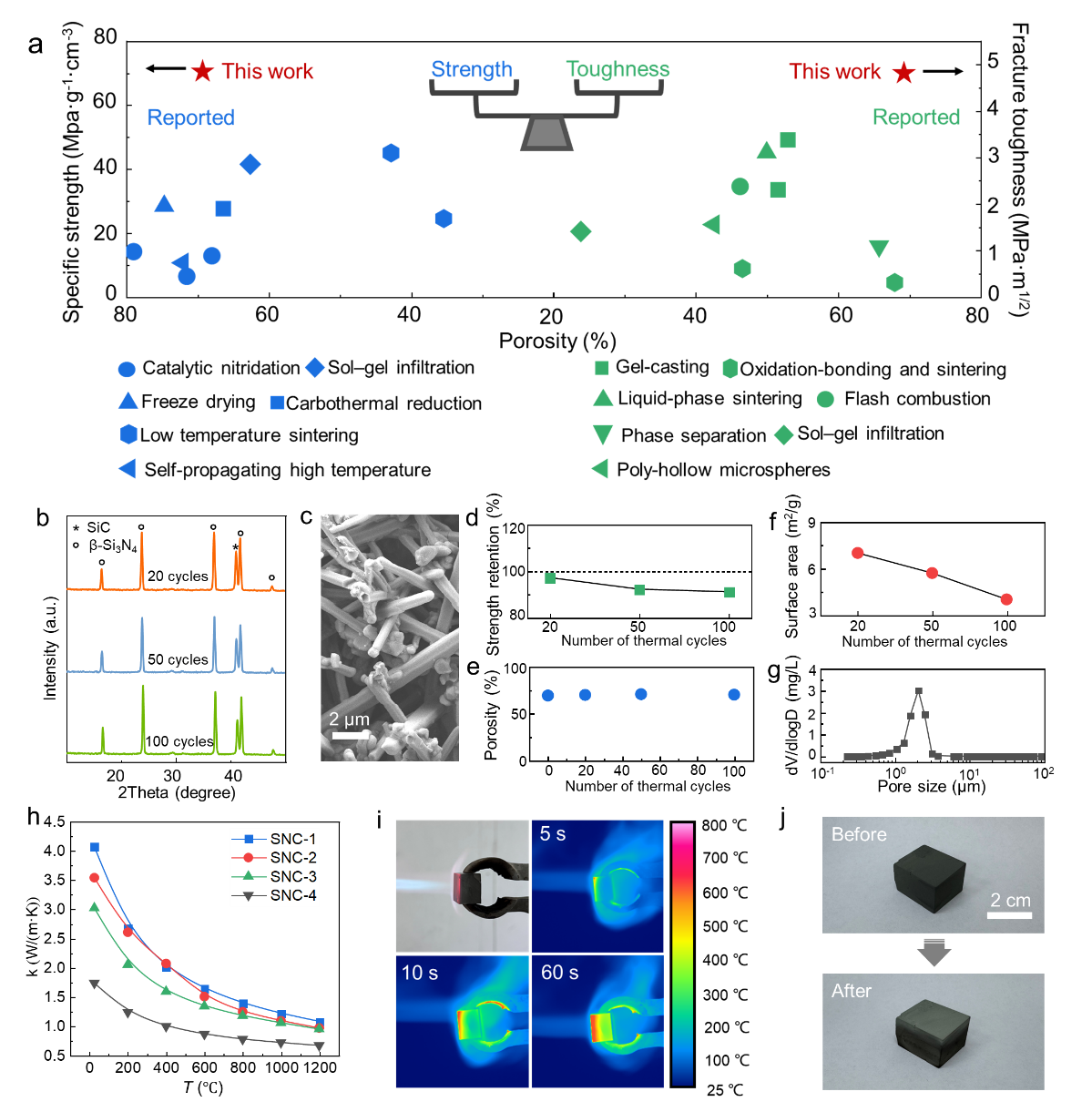 研究表明高长径比氮化硅晶粒反应嵌合与共生形成强界面结合,同时原位生成的碳化硅钉扎晶界进一步增强了骨架结构。在69.3%的气孔率下,抗压强度和断裂韧性分别达到62.4 MPa和4.8 MPa·m1/2,实现了强度与韧性的协同提升。在结构高温稳定性方面,材料在空气中可稳定至1200℃,经历100次高温热循环后,强度保持率仍有91%,并表现出优异的热防护性能。