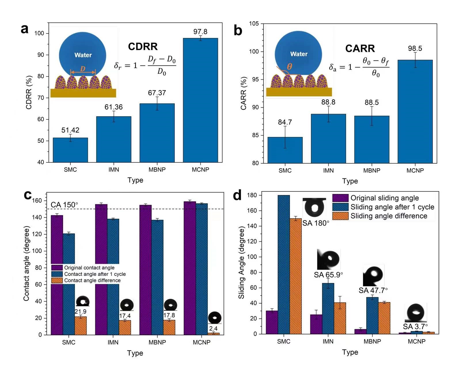 钟敏霖教授团队采用超快激光烧蚀和化学刻蚀等方法制备了四种不同微纳结构的超疏水表面(即规则微米柱-纳米颗粒二级表面,微米凸起-纳米颗粒不规则二级表面、微米柱单级表面以及化学刻蚀不规则微纳米表面),开展系统的结冰和融冰研究,发现在超快激光制备的规则微米柱-纳米颗粒二级超疏水表面上,液滴在结冰与融冰循环后可以自发地恢复到原始的Cassie状态,其接触直径恢复率和接触角恢复率高达97.8%和98.5%,并且融化后的液滴在3.7°的倾角下即可快速脱离,而其他表面均无法自发从Wenzel状态恢复到Cassie状态。