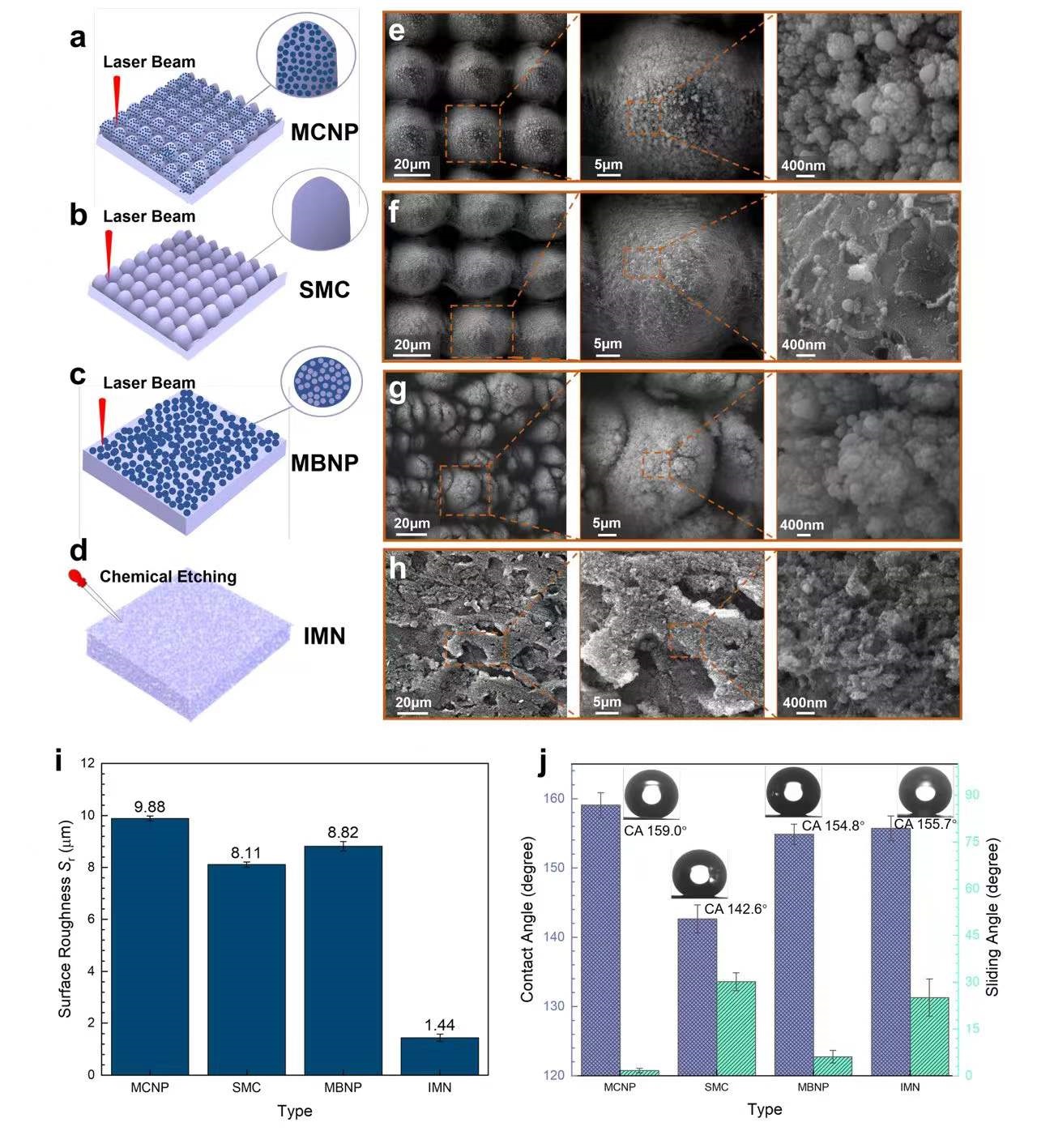 图1 超快激光和化学刻蚀制备的四种表面结构及其粗糙度和疏水性