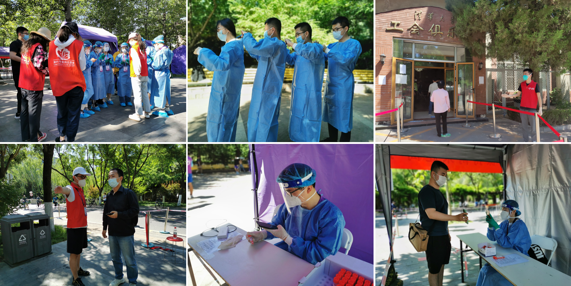 校内核酸检测点位志愿者合影(左上:工会俱乐部;右上:祖龙广场;左下:听涛园西侧广场;右下:紫荆篮球半场)