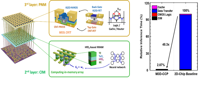 图2 基于单片三维集成的混合存算一体芯片架构。该芯片由3层组成:第一层为标准硅130 nm工艺的CMOS控制逻辑,第二层为基于HfO2 RRAM 1T1R阵列的存算一体层,第三层是基于CNT/IGZO的CFET用于后道逻辑、SRAM缓存和路由。