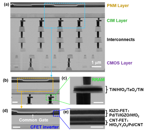 图3 芯片横截面TEM图像。(a) 本工作展示芯片 (b) RRAM单元和CFET反相器 (c) HfO2基RRAM单元 (d) CFET反相器 (e) CFET共栅薄膜结构。比例尺=250 nm。