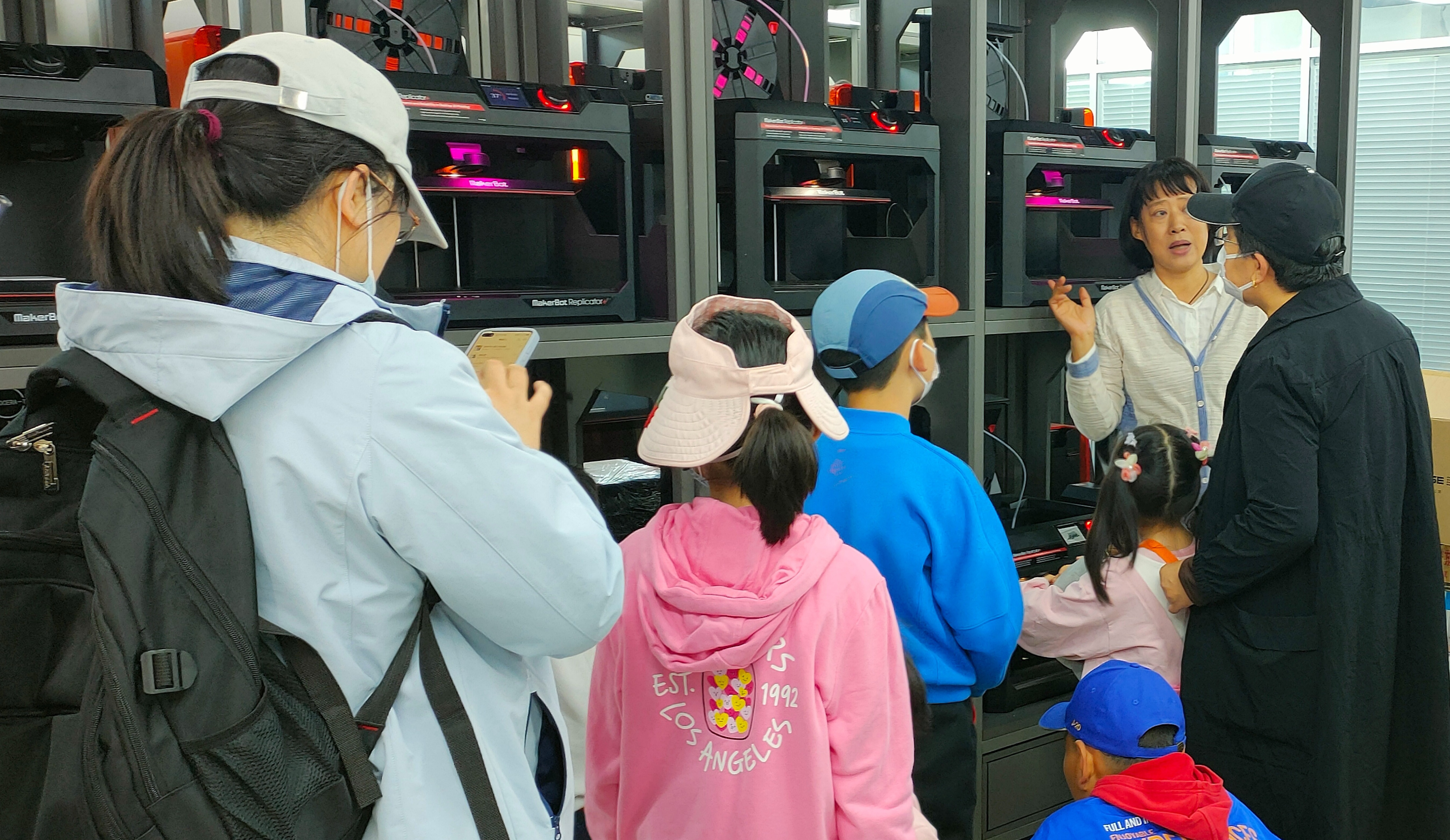 在3D打印实验室的展柜上多台3D打印设备同时进行打印,实验教学中心刘蓉翾老师向大家介绍了3D打印机立体光固化成型、熔融沉积成型等多种成型方式及成型原理,实验教学中心王远航老师及志愿者带领大家参观了不同打印机的打印过程,并在结束后向小朋友们赠送了3D打印院庆专属纪念小象。