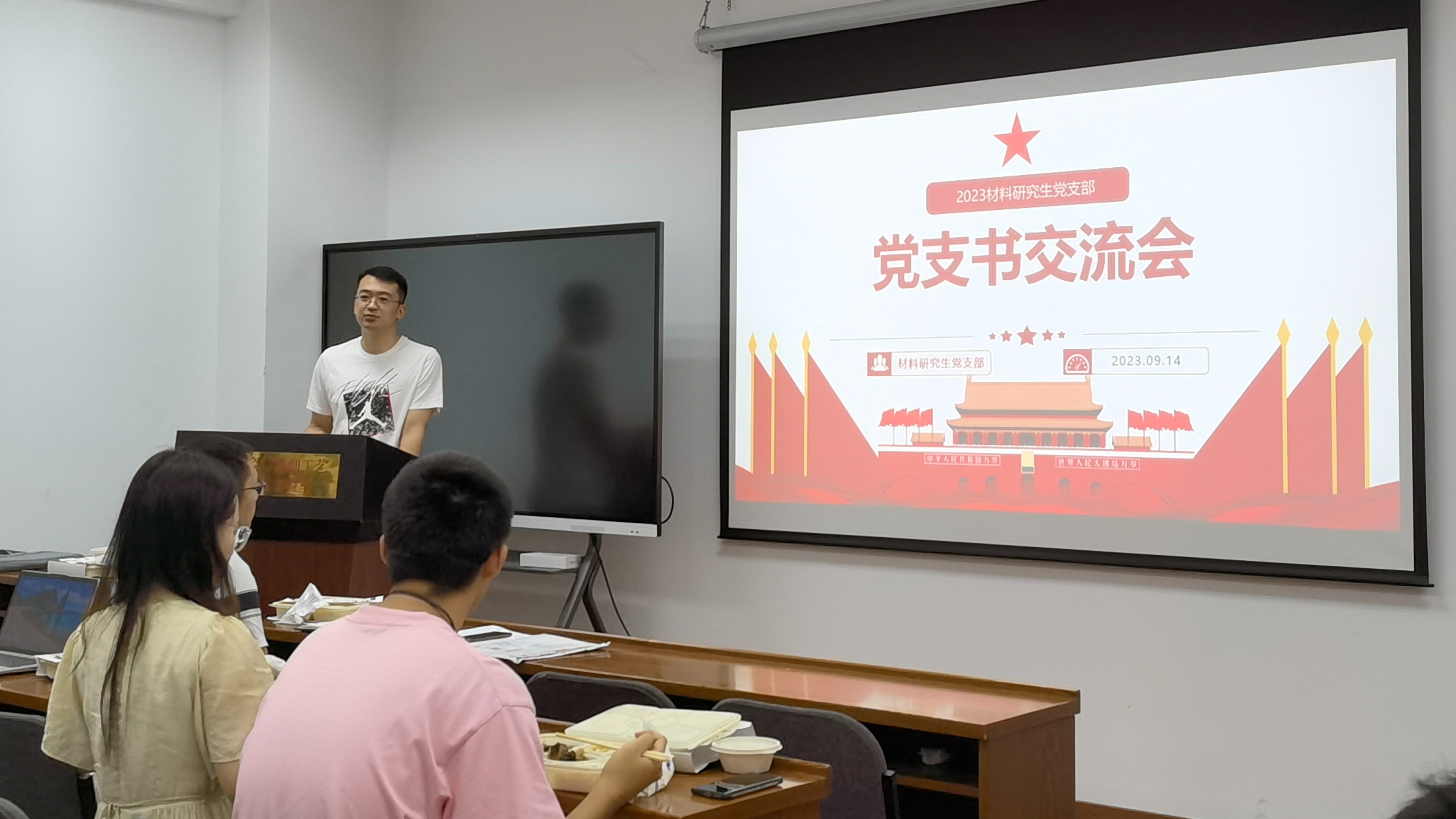 研团书记陈雅薇从研团实践、宣传、讲师团、志愿活动四个方面向大家介绍了研团资源以及研团立足于员工需求,为材子材女提供的各项服务。未来希望各党支部能和研团齐心同力,一体推进党团班建设,深化拓展党建合作。