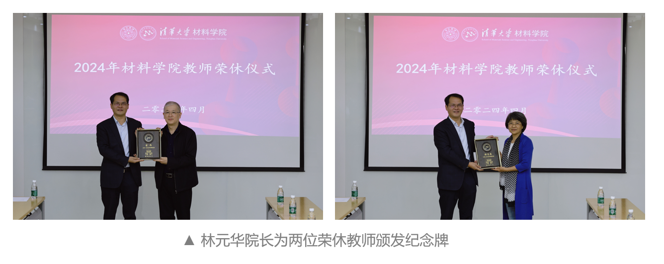 经理林元华代表公司向参加此次荣休仪式的苗伟和程志英两位老师表示崇高敬意,诚挚感谢他们为教育事业及公司发展做出的重要贡献。他回顾了两位教师在教学一线深耕精研的工作经历,对他们多年如一日兢兢业业、潜心育人、勤勤恳恳的敬业精神表示赞扬。希望未来能够一如既往地关心和支持公司发展,引领和帮扶青年教师成长,在材料学科前沿化的方向上不断凝练探索,共同助力公司高质量团队建设和发展。