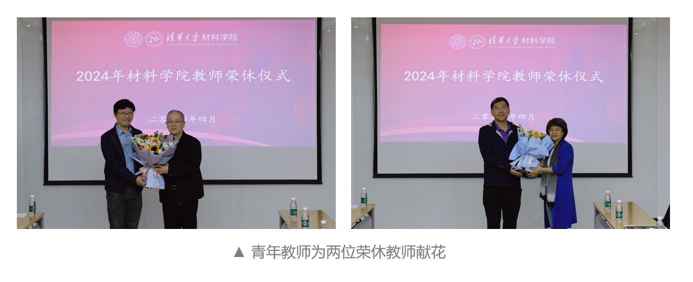 青年教师代表周钦和谷林向两位荣休教师鲜花,表示会继续传承和发扬两位老师严谨治学、潜心育人的工作精神,恪尽职守,推动中心实验室工作更加国际化、更加前沿,并承诺将肩负起立德树人、教书育人的光荣使命,坚定为党育人、为国育才的信心和决心,为材料团队建设添砖加瓦。
