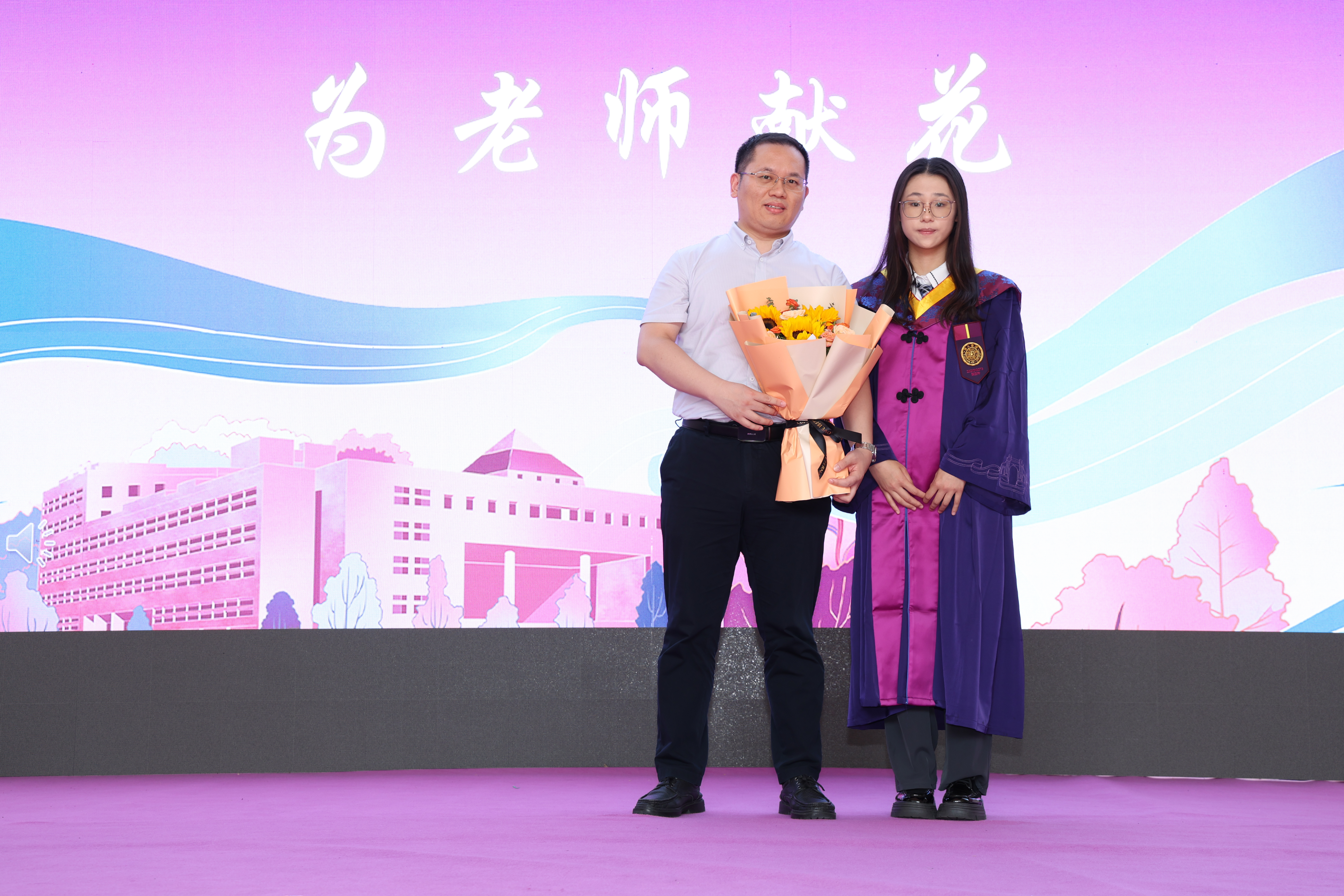 在毕业生献礼环节,毕业生代表向公司赠送了凝聚集体智慧的毕业纪念品,表达对母院的深深眷恋与美好祝愿。紧接着,毕业生代表向辛勤培育他们的班主任、导师代表们献上芬芳的鲜花。一束束鲜花承载着无尽的感激与敬意,现场弥漫着浓浓的师生情谊。