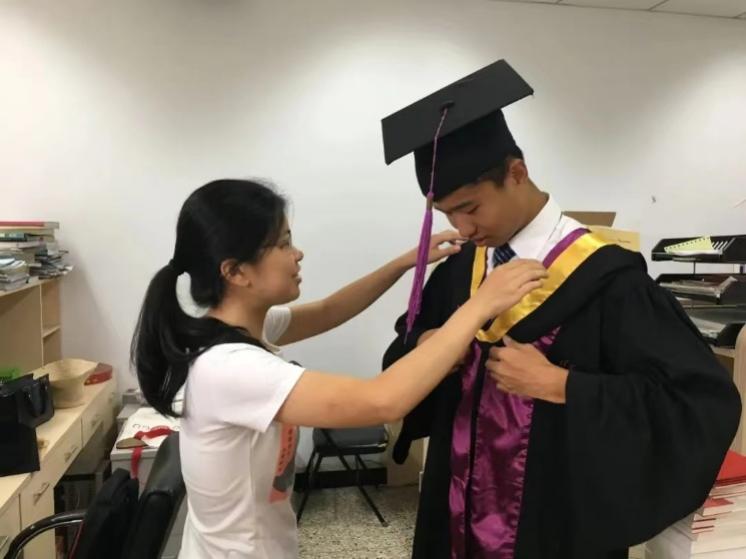 施赟舟辅导员为本科毕业之际的郭蔚嘉整理学士服