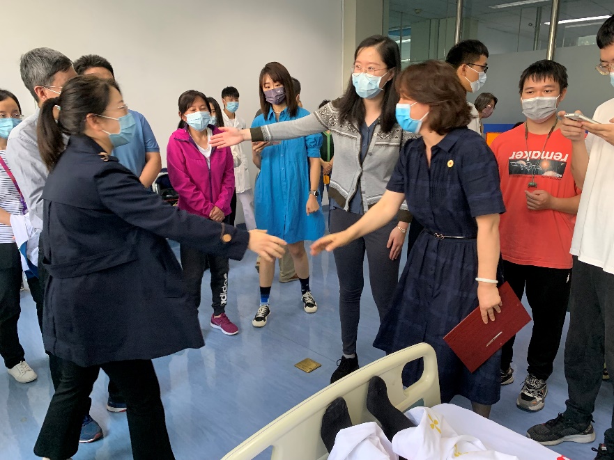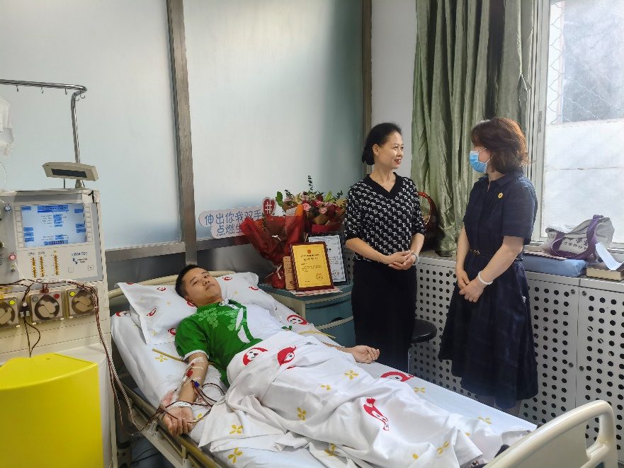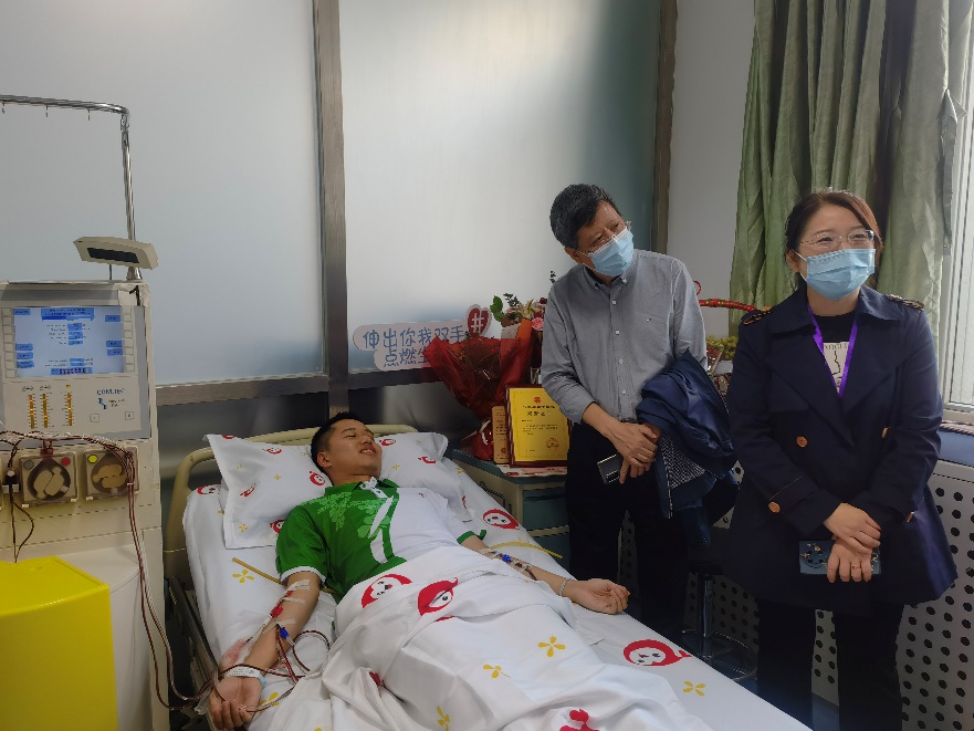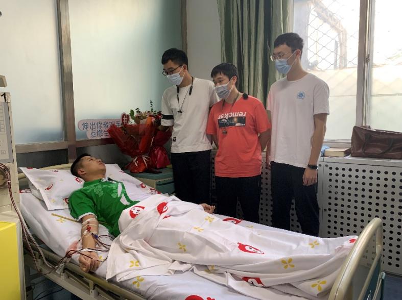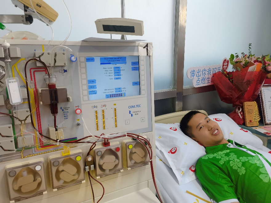 2022年9月26日,在解放军总医院第五医学中心的一间病房内,郭蔚嘉正在进行造血干细胞捐献。前来看望他的公司各级领导和辅导员们站满了采集室,表达公司师生对他无私捐赠的鼓励和赞扬。郭蔚嘉的左右两臂分别插着一根管子,血液从右臂抽出,提取出造血干细胞后再从左臂输入,这样的过程足足持续了四个多小时,共循环12000多mL血液。