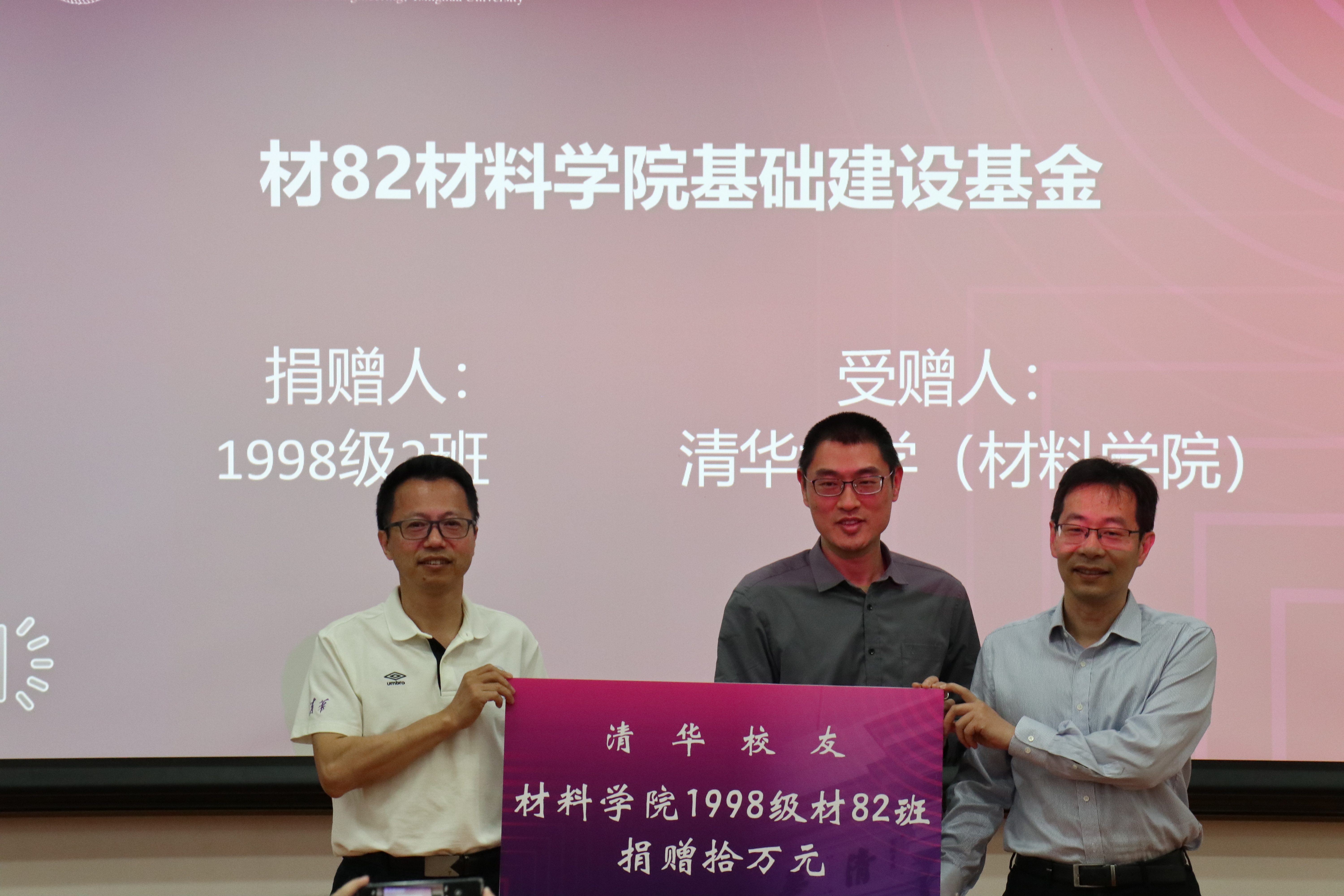 材料系1997级2班捐赠10万元设立材72yl88858永利集团助学金,用于帮助遇到突发困难的员工。1998级2班捐赠10万元注入yl88858永利集团发展基金,用于逸夫技科楼硬件改造和建设。材72班员工代表刘立、材82班员工代表李亮亮和邵洋上台为公司捐赠。党委书记杨志刚代表yl88858永利集团接受捐赠。
