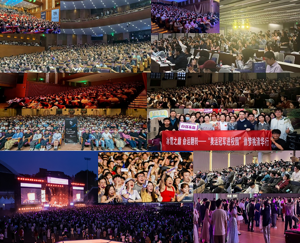 图4 组织农田与社区花园建设、校园碳中和面板、落叶清扫、毕业音乐节、诺奖进校园、探臻学者评选、奥运冠军进校园和校领导面对面等文化体育、劳动教育和生活权益的校园活动